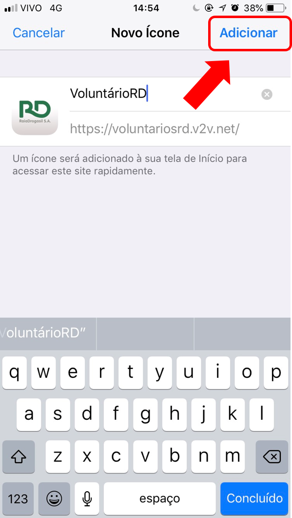 4. Ao clicar no ícone "Tela de Início", a tela abaixo aparecerá. Altere o nome do aplicativo para aquele que preferir e clique em "Adicionar".